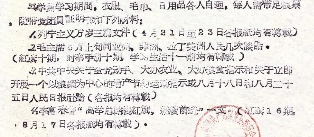 五是自带物品:学习期间,个人日常所需的衣服、毛巾、日用品等,均由学员自备,而且,别忘了带足粮票(粮票是计划经济时代的居民购粮凭证)。此外,党团员证明书,即党团员组织关系介绍信,务必随身携带。