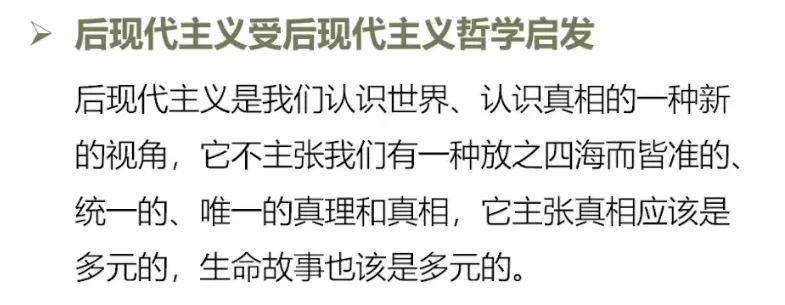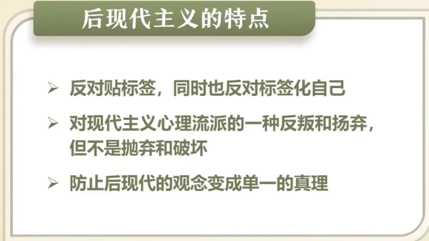 现代主义心理学——了解人的基本心理规律,据此进行教学、再教育、心理健康等,关注抽象的心理规律后现代主义心理学——反思上述的心理规律是不是真的可以应用到任何一个人身上,关注每个活生生、有血有肉、有故事的个体心理的规律,并对习以为常的观念做反思和批判后现代思潮:首先从艺术、建筑学领域发展起来,始于对“对称美”的反思任何一个流派所认定的健康人格,会成为这个流派在临床实践中的指南针,但各流派对什么是健康人格的界定是不一样的,会造成一种错觉。后现代主义不会去设定这样的统一标准,而是认为每个人都有独特的生命倾向或对生活的期待,完全没必要非得迫使自己去适应一个社会常规所规定的生活方式。去中心,扬边缘——关注每个个体独特的声音,而不是让它回归大众公认的标准。