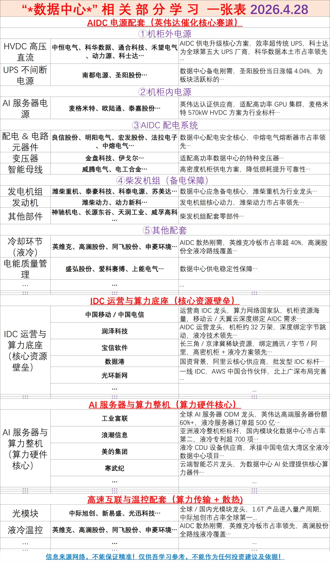 总体来说,数据中心是一个由AI算力需求和国家“东数西算”战略双轮驱动的朝阳产业。后期或重点关注手握核心资源的头部IDC运营商+在液冷、高端服务器等环节具备核心技术的硬件供应商...