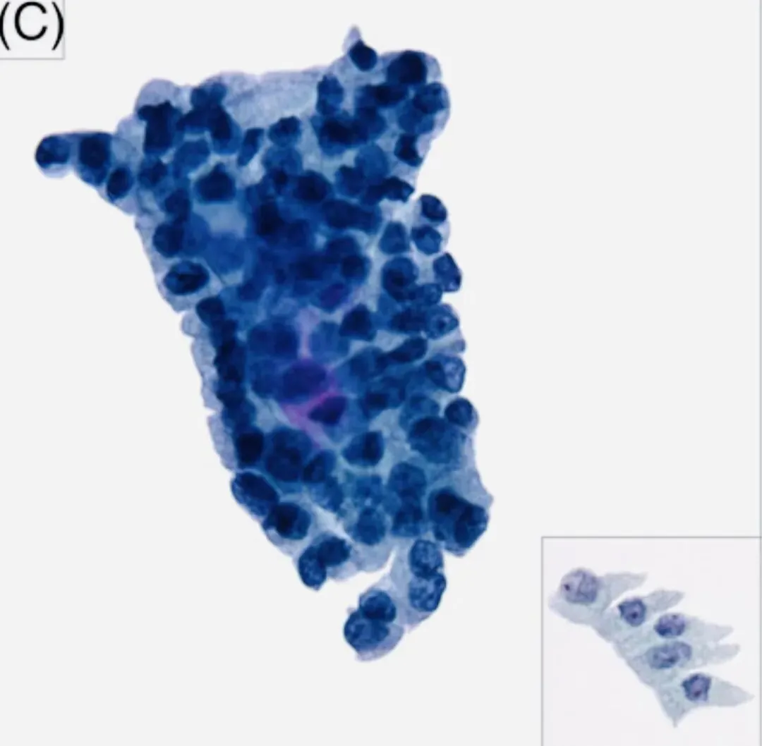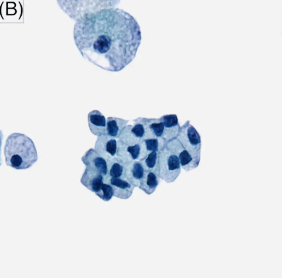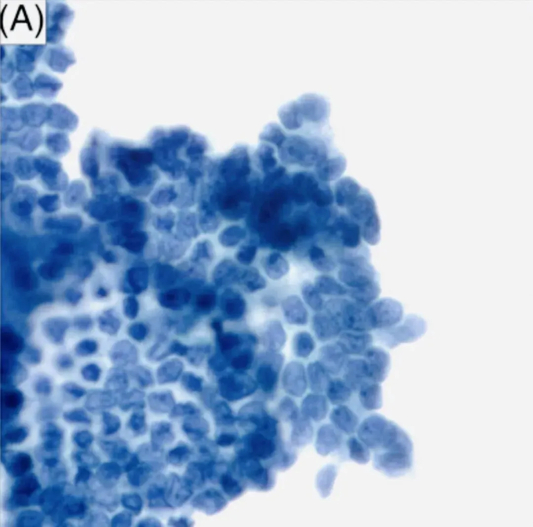 A:经典PTC病例,显示胞质致密、核质比较高、细胞边界不清。