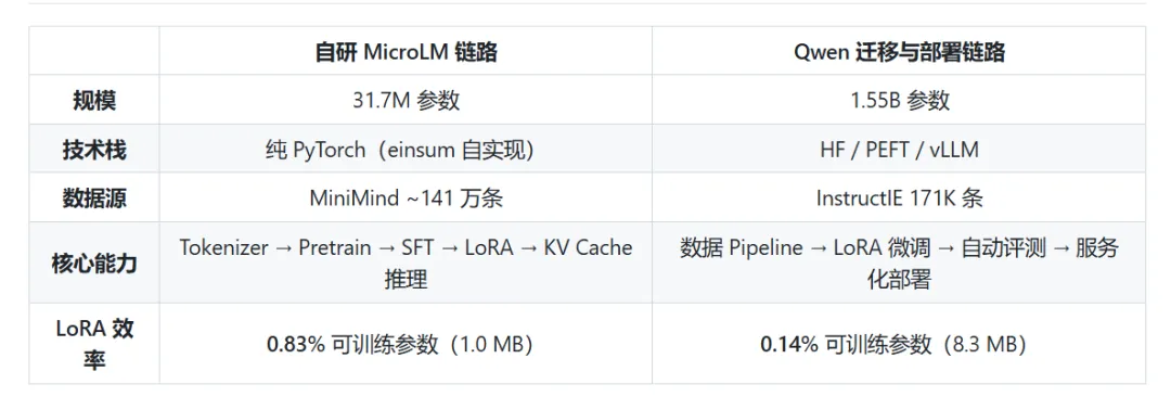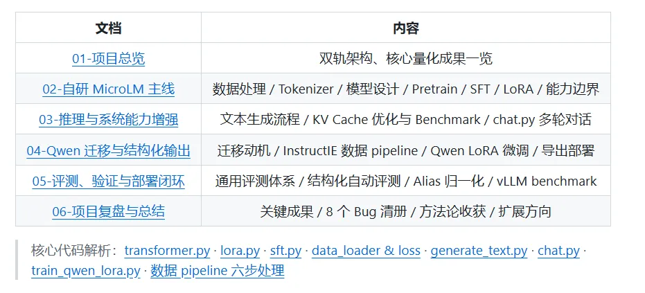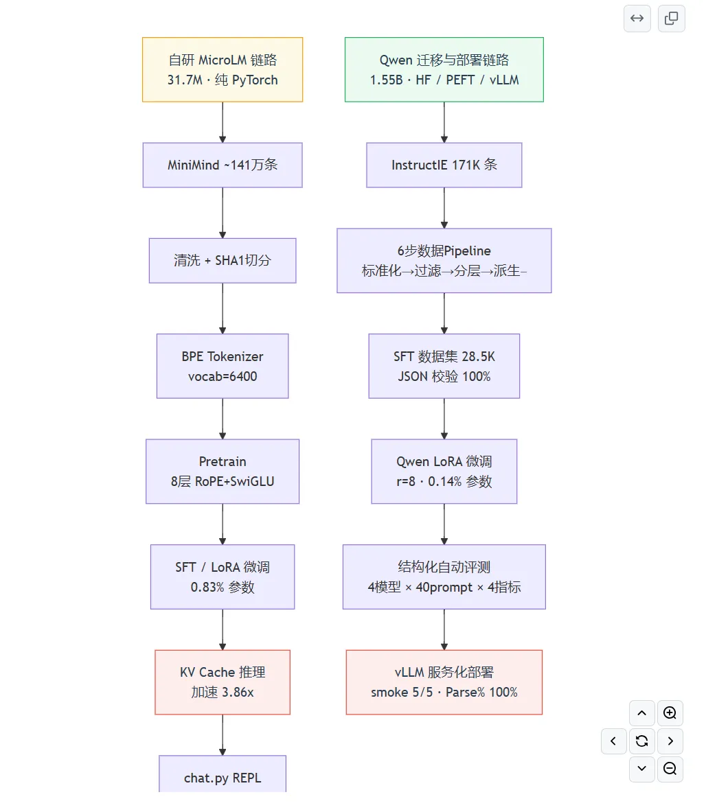 对于正在学习大模型的同学,可能对于高效参数微调,模型预训练和后训练等概念并不陌生,但是没有手搓过相应的代码,往往对这些概念的理解不够深刻学习大模型无非就是要学会从零开始搭建一个能训练,能微调,能推理的完整LLM链路,覆盖tokenizer训练,语料处理,预训练,SFT, Lora,推理优化,评测与部署等环节这一期主要是给大家推荐一个适合新手小白的大模型项目主要介绍这个项目的完整内容和技术路线,既可以学习手搓一个微型的LLM,也可以采用Qwen大模型来实战,重要是理解整个pipeline这一部分主要内容包括预训练数据处理与tokenizer, TransformerLM模型设计,预训练的流程,SFT数据协议与训练机制,Lora接入与高效参数微调,模型能力边界探索等,一定要自己去把每个环节都写一遍代码,这样子理解会非常深刻这一部分主要介绍如何调优大模型,包括prompt的设计,KV Cache优化,Benchmark设计,交互式对话系统设计等,这一部分还是有些难度的,一定要理解每个操作背后的原理这一部分把自研链路积累的方法论迁移到开源生态(Qwen2.5-1.5B-Instruct),同时把任务聚焦到结构化输出。它的定位不是"再做一次训练",而是"同一套方法论在工业工具栈上的验证 + 能力聚焦带来的可量化收益"。突出"迁移"和"聚焦",不是简单复制第二章这一部分需要建立一套可复现的统一评测流程——同一组 prompt、同一套采样参数、同一个随机种子,让不同模型之间的差异可比以上内容覆盖了大模型的各个环节,并且均有相应中文文档说明,不用担心看不懂代码,这个项目大概需要2周左右的时间,后面也可以写到简历上作为项目使用资料获取: