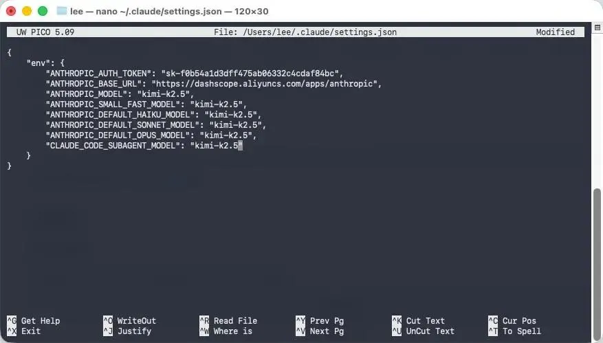 // env变量,以下字段复制到文件中{ "env": {"ANTHROPIC_AUTH_TOKEN": "sk-7ff266e6a1656667a81b1b6a8daaadd3","ANTHROPIC_BASE_URL": "https://dashscope.aliyuncs.com/apps/anthropic","ANTHROPIC_MODEL": "kimi-k2.5","ANTHROPIC_SMALL_FAST_MODEL": "kimi-k2.5","ANTHROPIC_DEFAULT_HAIKU_MODEL": "kimi-k2.5","ANTHROPIC_DEFAULT_SONNET_MODEL": "kimi-k2.5","ANTHROPIC_DEFAULT_OPUS_MODEL": "kimi-k2.5","CLAUDE_CODE_SUBAGENT_MODEL": "kimi-k2.5" }}