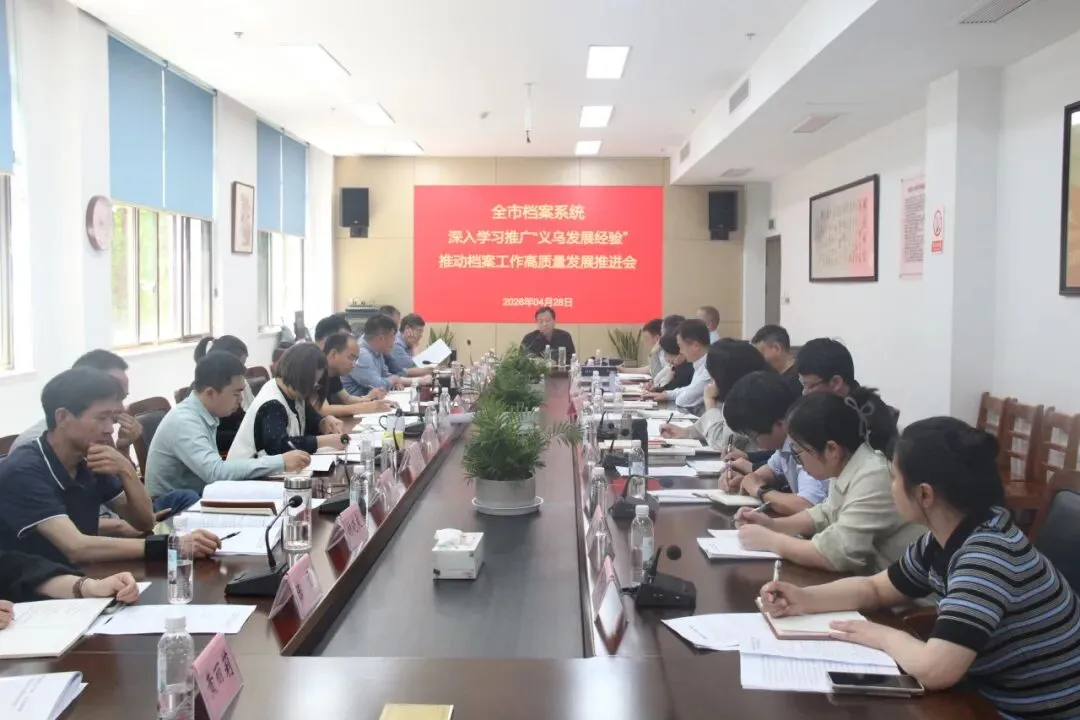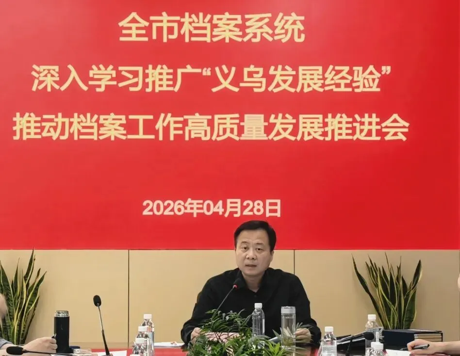 4月28日上午,市档案局、档案馆组织全市档案系统召开深入学习推广“义乌发展经验”推动档案工作高质量发展推进会。会议认真学习贯彻习近平总书记关于“义乌发展经验”重要指示精神,传达学习了全国、全省档案局长馆长会议精神,全面总结2025年全市档案工作,部署2026年重点任务。市委副秘书长、市档案局局长、市档案馆馆长陈川主持会议并讲话。