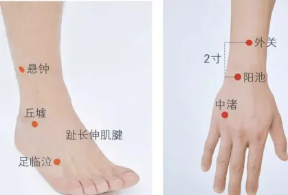 (3)取穴:阳池或丘墟穴附近寻找阿是穴。