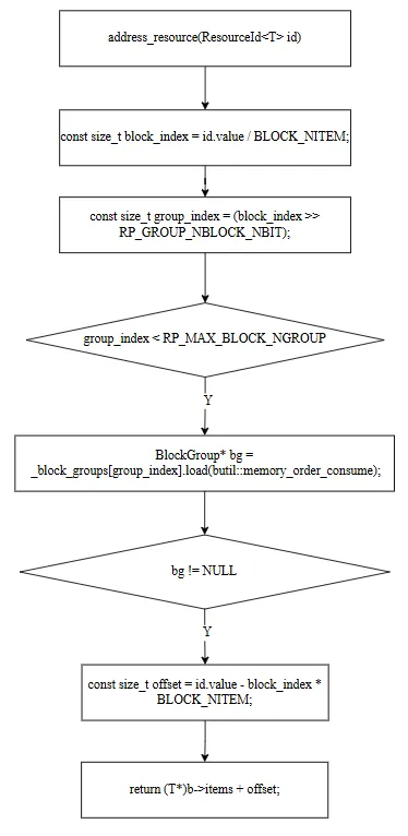 ResourceId.value │ ├─ block_index = value / BLOCK_NITEM │ │ │ ├─ group_index = block_index >> 16 │ │ └─ _block_groups[group_index] → BlockGroup* │ │ │ └─ block_in_group = block_index & 0xFFFF │ └─ BlockGroup->blocks[block_in_group] → Block* │ └─ offset = value - block_index × BLOCK_NITEM └─ Block->items + offset → T*