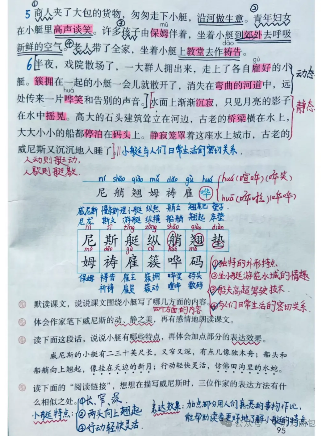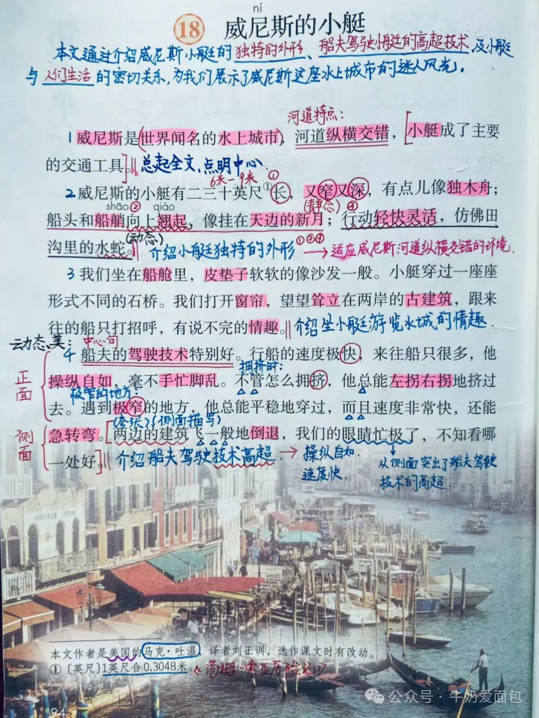 18. 《威尼斯的小艇》的作者是美国作家马克·吐温,课文主要介绍了威尼斯重要的交通工具——小艇的样子、船夫的高超驾驶技术和小艇的重要作用, 展示了这座水上城市的特有风光, 表达了作者对威 尼斯美丽风光的热爱之情。