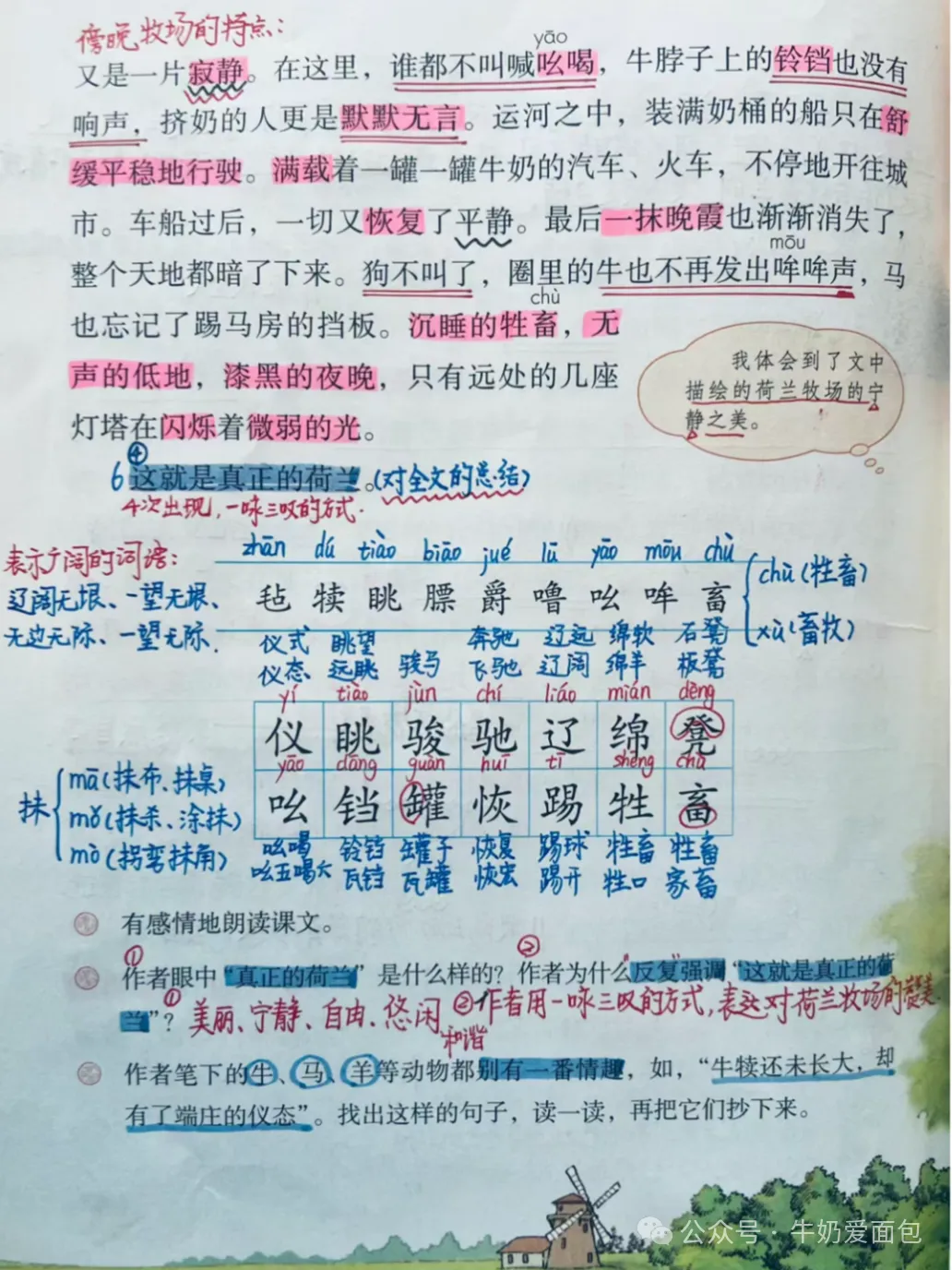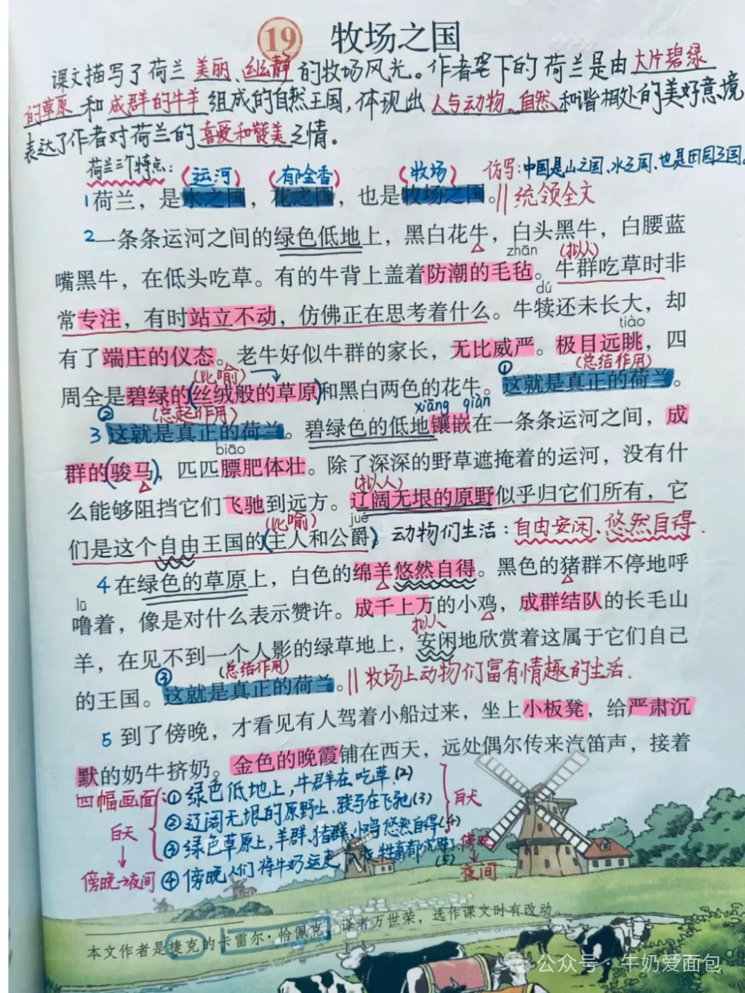 19. 《牧场之国》的作者是捷克作家卡雷尔·恰佩克,课文描写了荷兰美丽的田园风光, 全文紧紧围绕荷兰牧场白日的辽阔无际、宁静和谐和夜晚的祥和寂静来写,展现了荷兰蓝天、白云、牛羊成群的优美迷人、自然和谐的景观。