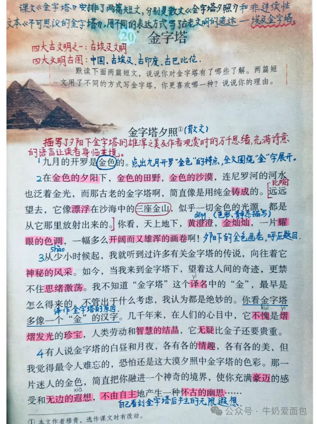 《金字塔夕照》描写了夕阳下金字塔的雄浑之美以及作者由此引发的联想,抒发了作者对金字塔的喜爱与赞叹。