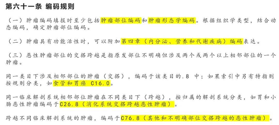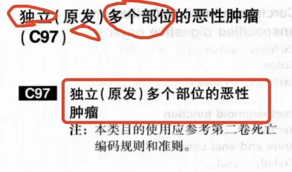 对多处原发肿瘤同时进行诊疗时,C97 为主要编码,再分别编码各部位原发恶性肿瘤;只对其中一个肿瘤进行诊疗,该原发恶性肿瘤为主要编码,其他部位的肿瘤分别编码,同时附加编码C97。
