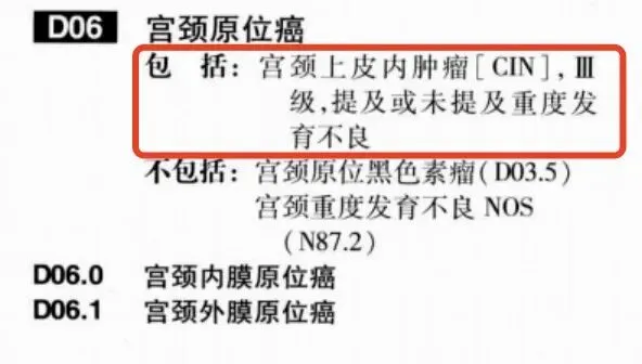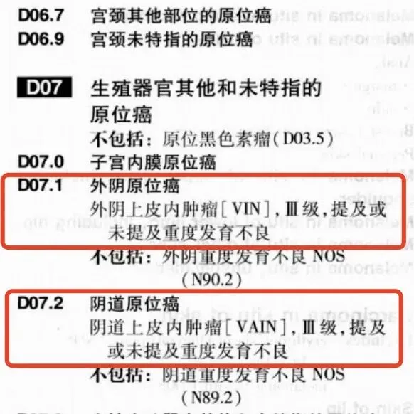 第六十三条 宫颈(CIN III)(D06)、阴道(VAIN III)(D07.2)及外阴(VIN III)(D07.1)均按原位癌分类。