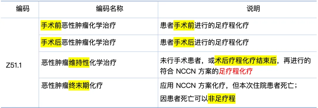 非疗程化疗、不符合 NCCN 方案或化疗方案中的药品未在本次住院费用中全部体现,按姑息性化疗(Z51.104)填报。