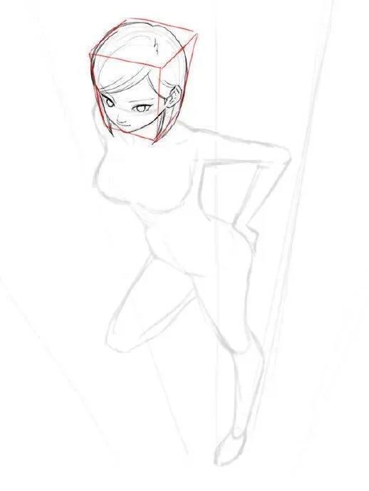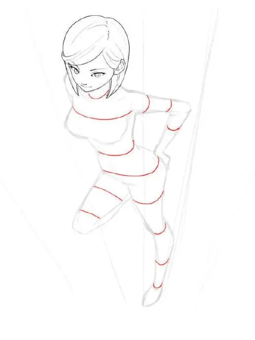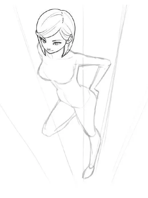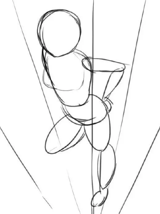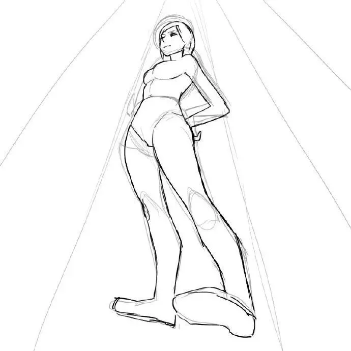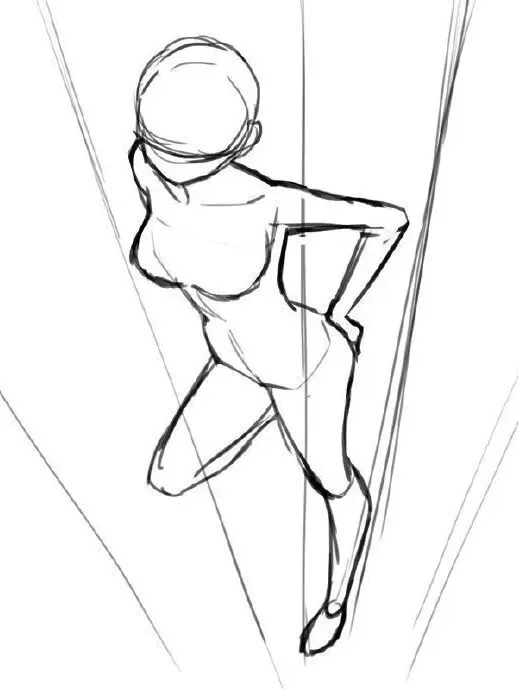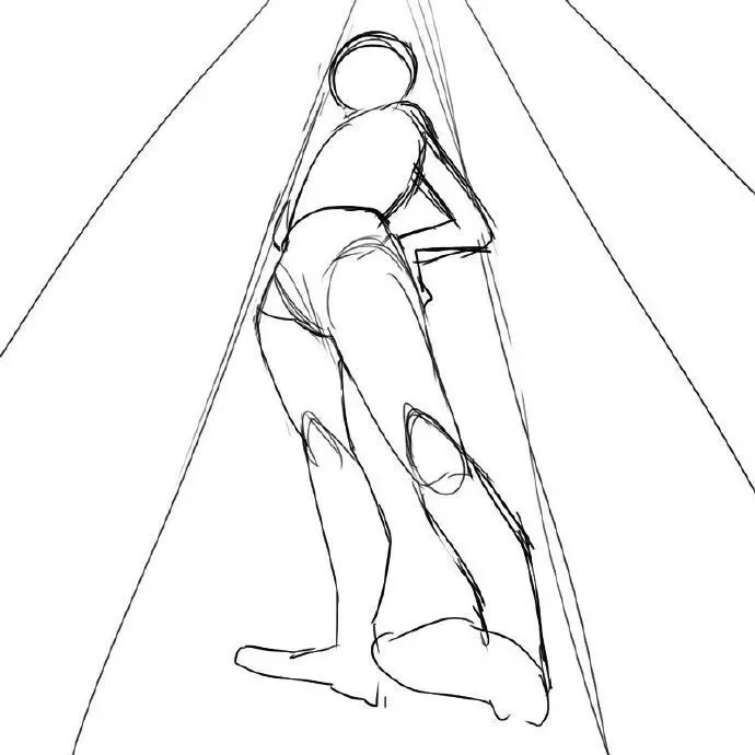 腿部拉长、脚部放大(因近大远小)。