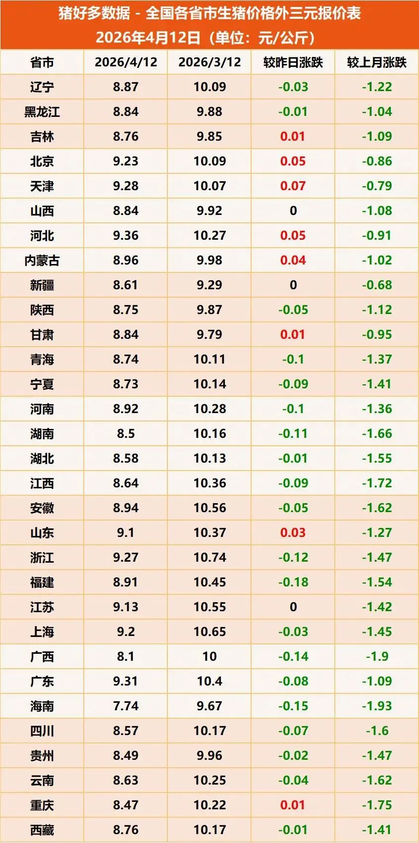 4月已经来到中旬,全国生猪价格仍在跌跌不休,屡创新低!据猪好多数据监测显示,2026年4月12日全国外三元生猪均价为8.76元/公斤,较昨日再下跌0.04元/公斤,多地猪价维持在4元区间。
