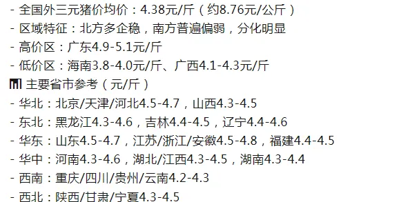 (4月13日)全国外三元生猪均价约4.38元/斤,较昨日下跌0.01元/斤,跌幅0.30%,连续5日下跌但跌幅收窄,创今年以来及2019年以来新低。?