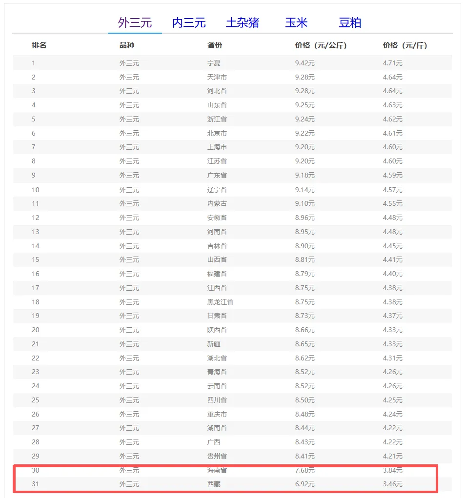 从各省市表现来看,所有地区较上周均出现大幅下滑,其中新疆、湖南、山西等地周跌幅超过每公斤2元,西藏以6.92元每公斤成为全国最低价,海南省也跌至7.68元,双双进入“3元区”;相对高价的宁夏、河北、天津等地也不过每公斤9.42元、9.28元,且较昨日多数仍为下跌或持平。