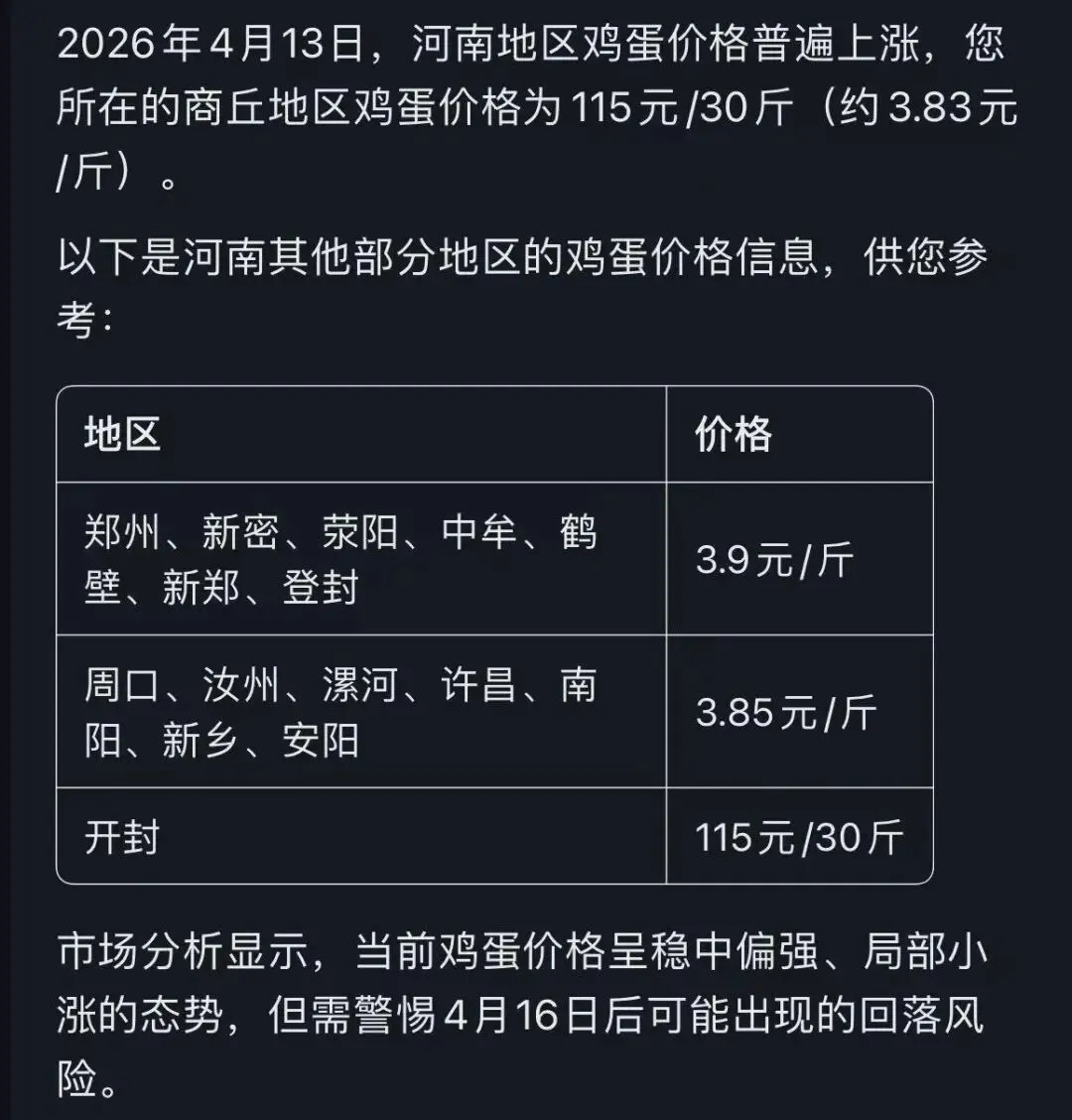今日鸡蛋价格参考(元/斤) 养羊网 2026-04-13 今日鸡蛋价格参考(元/斤) 养羊网 2026-04-13 上一篇:【超前猪价大预测】4月15日~4月18日!全国猪价! 下一篇:猪价分析:持续低价 您可能还会对下面的文章感兴趣111: 相关文章 2026年3月26日猪价(绿的心慌)每日新增淘汰母猪价格、福建区域各阶段肥 2026-2- 24全国猪价预测 2026.1.30号猪价,跌! 【明天猪价】3月12日全国猪价已更新!)