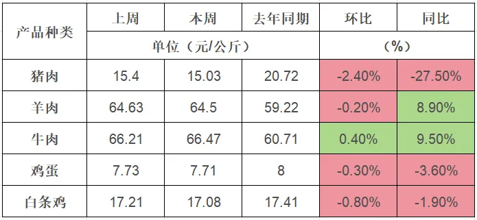 农业农村部最新监测数据显示,4月3日至9日,全国农产品批发价格200指数收于118.11点,环比下降1.70点、同比下降1.42点,价格整体继续走弱。畜禽、蔬菜、水果、水产四大板块走势分化明显,几组关键信号值得重点关注,咱们一个个来看。 猪肉持续探底,牛羊肉逆势上涨 当周,全国猪肉批发均价降至15.03元/公斤,环比再降2.4%,同比跌幅更是从前一周的24.4%扩大至27.5%,是拉低当周价格指数的主要因素。 为啥下跌趋势还在扩大?核心是供需两端的双重承压:供给端,农业农村部数据显示,2025年末全国能繁母猪存栏3961万头,处于3900万头正常保有量的绿色区间上限,前期能繁母猪高位存栏对应的产能持续释放,规模养殖场出栏节奏并未放缓;需求端,清明节后肉类消费进入传统淡季,市场采购需求不旺。几重因素叠加,猪肉价格短期内很难迎来反转。 与猪肉一路下行不同,牛羊肉走出了相对独立的上涨行情:牛肉、羊肉批发均价同比分别上涨9.5%和8.9%,打破了过往猪牛羊价格“同涨同跌”的传统联动规律。出现这样的分化,一方面是居民肉类消费选择日趋多元,需求端形成稳定支撑;另一方面,牛羊产能周期阶段性偏紧,也为价格形成阶段性支撑。禽蛋方面,鸡蛋、白条鸡价格整体稳中偏弱,并无明显波动。