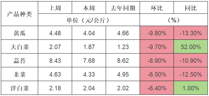 春菜集中上市,蔬菜价格单周跌4.2% 全国重点监测的19种蔬菜平均批发价格降至3.91元/公斤,环比下跌4.2%,创下近期单周最大跌幅。其中,黄瓜、大白菜、蒜苔、韭菜、洋白菜环比跌幅均超6%,黄瓜单周跌幅达9.8%。 菜价这波明显回落,核心原因就是换季换挡:南方大棚春菜集中扎堆上市,叠加北方冬储菜加速收尾,市场供给整体充裕,直接带动菜价季节性回落。 这里要特别提醒大家注意一组数据:大白菜当周环比下跌9.7%,但同比涨幅达52%。这个反差可不是说大白菜价格在大涨,而是去年同期产区价格跌至罕见低位,今年价格只是回到正常水平。换句话说,当前大白菜价格仍处于季节性回落通道,切勿误读为涨价信号。 表2 环比上升幅度较大的蔬菜