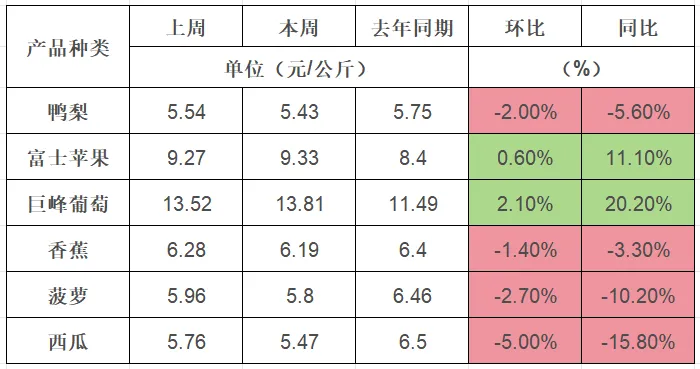 冷库果源进入收尾期,水果价格涨跌不一 水果市场方面,全国重点监测的6种水果平均批发价格为7.67元/公斤,环比微跌0.6%,不同品类走势差异明显。其中,西瓜、菠萝、香蕉、鸭梨价格环比下行,富士苹果、巨峰葡萄逆势涨价,其中巨峰葡萄同比涨幅达20.2%,富士苹果同比涨幅达11.1%。 出现这样的分化,核心原因十分明确:冷库储存的果品已进入收尾期,市场上优质果源供给持续减少,对价格形成有效支撑。 表4 重点监测的水果价格及变化幅度