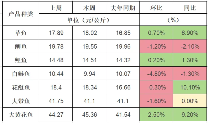 季节性消费形成支撑,淡水鱼价格整体偏强 水产品市场涨跌互现,品类分化明显。其中,草鱼、鲤鱼价格环比均有上涨,花鲢鱼同比涨幅达10.1%,淡水鱼整体表现偏强;白鲢鱼单周下跌4.8%,出现短期波动。海水鱼方面,大黄花鱼价格环比上涨。清明前后的季节性消费需求释放,叠加春季捕捞节奏调整,共同为淡水鱼价格筑牢了运行底部。