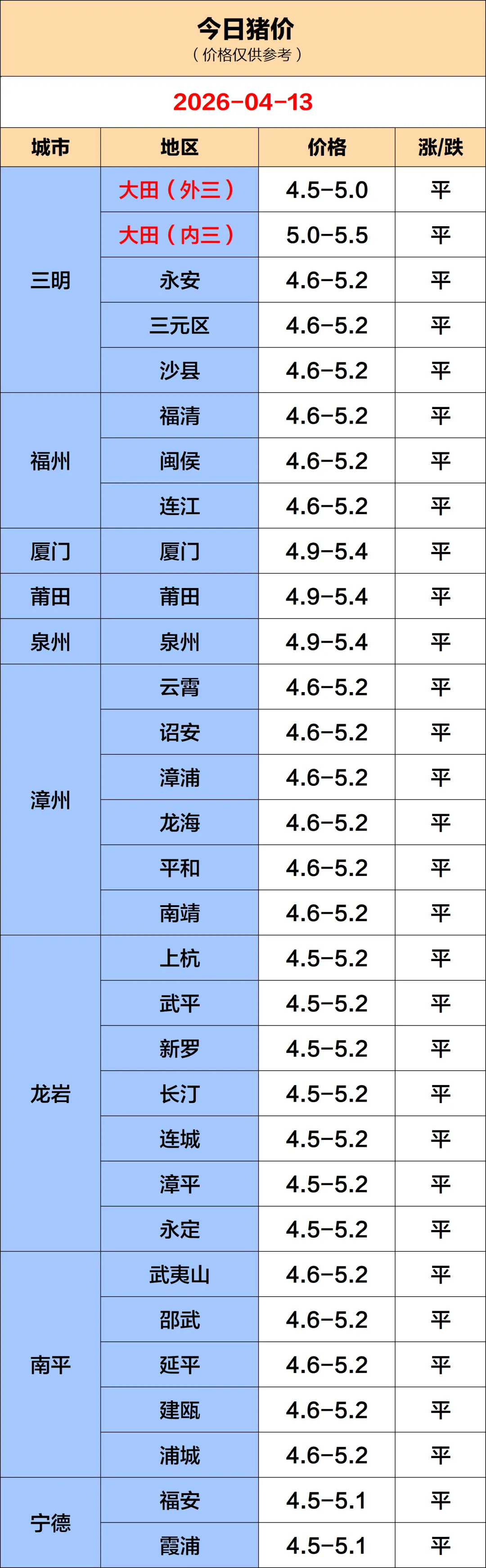 温馨提示:各场因猪的品种、品质、大小、单批销售数量等因素不同,实际售价均可能有所差异,以上报价仅供参考。(以上数据参考来源:福建鸣洋)