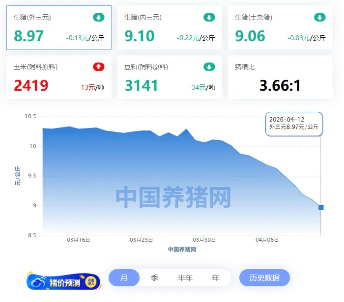 供应过剩未见缓解,全国猪价全面下跌 根据中国养猪网2026年4月12日监测数据,今日全国生猪价格延续全面下跌态势,外三元标猪均价已跌至每公斤8.97元,约合每斤4.49元,较昨日下跌0.13元。