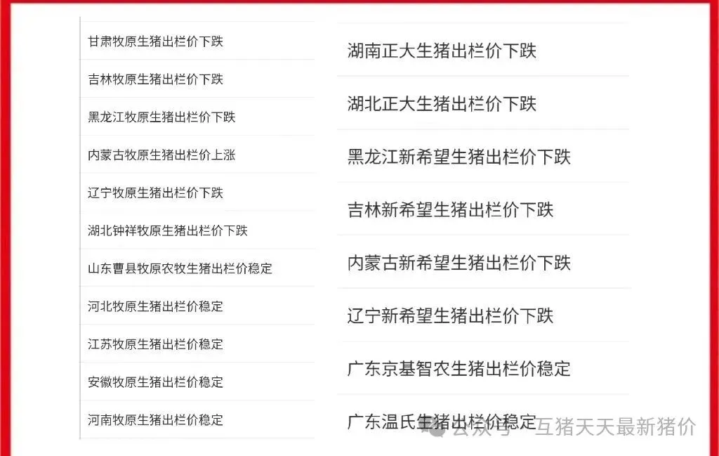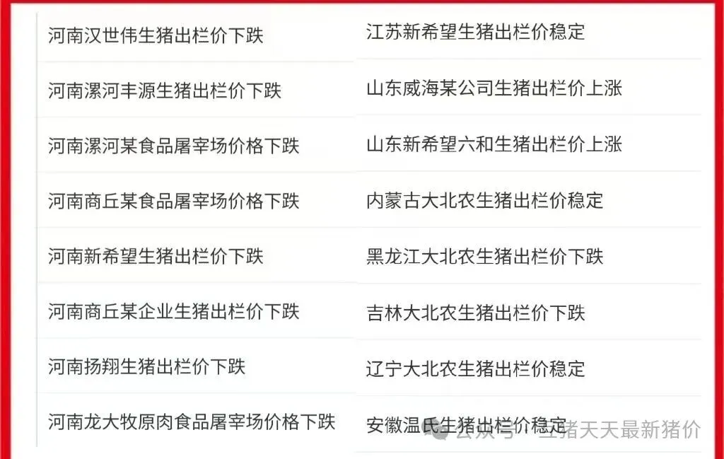 分地区来看,今天东北地区散户基本稳定,个别地区小幅涨跌,今天哈尔滨大江明水屠企,齐齐哈尔屠企稳定,长春佳龙,大连础明食品稳定,辽宁星源食品上调!猪企方面,黑龙江吉林大北农下跌,辽宁大北农稳定。东北新希望下跌,东北散户主流价在4.2-4.5之间,辽宁个别地区大体重标猪4.67元!