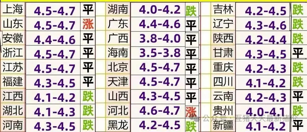 华东华中地区大部稳定,局部小幅涨跌,上涨主要在山东部分猪企,下跌主要在湖南局部,散户猪价变化不大,今天山东新希望上调5分,接猪价9.35元每公斤,今天江苏温氏安徽温氏湖北温氏稳定,湖北正大湖南正大湖南天心食品下跌,今天华东地区主流价在4.4-4.7元左右,华中地区主流价在4.2-4.5之间,湖南个别低价4.1左右!