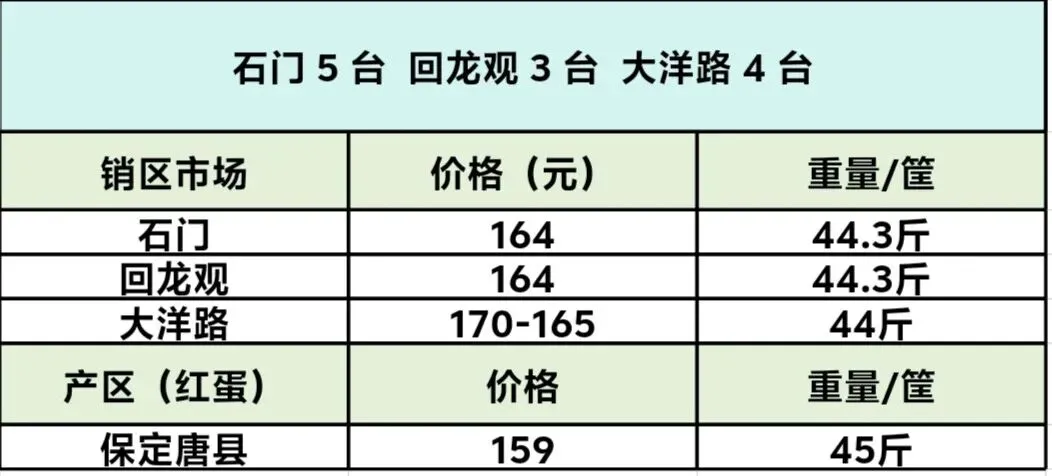 大洋路鸡蛋价格2026年 4 月 13 日报价 养羊网 2026-04-13 大洋路鸡蛋价格2026年 4 月 13 日报价大洋路 4 台,价格 170-165 元,没有剩车,走货快,明天回车预计 4-5 台附近。 养羊网 2026-04-13 上一篇:2026年4月13日鸡蛋价格,仅供 下一篇:猪价大逆袭,猪肉股震荡上涨!天邦涨停!啥情况? 您可能还会对下面的文章感兴趣111: 相关文章 近期价格更新!!! 成都想吃土鸡蛋和土鸡的看过来~ 2026.3.16明天猪价报价! 田地
