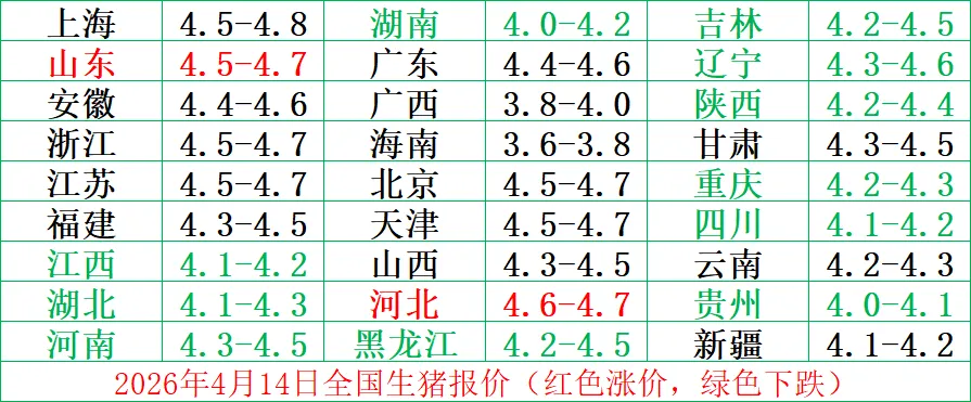 4月14猪价 养羊网 2026-04-13 4月14猪价 养羊网 2026-04-13 上一篇:猪价再走弱!多省下跌!2026.04.14-明日猪价 下一篇:【明日猪价】2026.4.14 您可能还会对下面的文章感兴趣111: 相关文章 明日(2026年3月1)鸡蛋价格预测 近期价格更新!!! 【明天猪价】26..1. 24 大范围上涨! 2025年4月13日全国各地生猪价格信息
