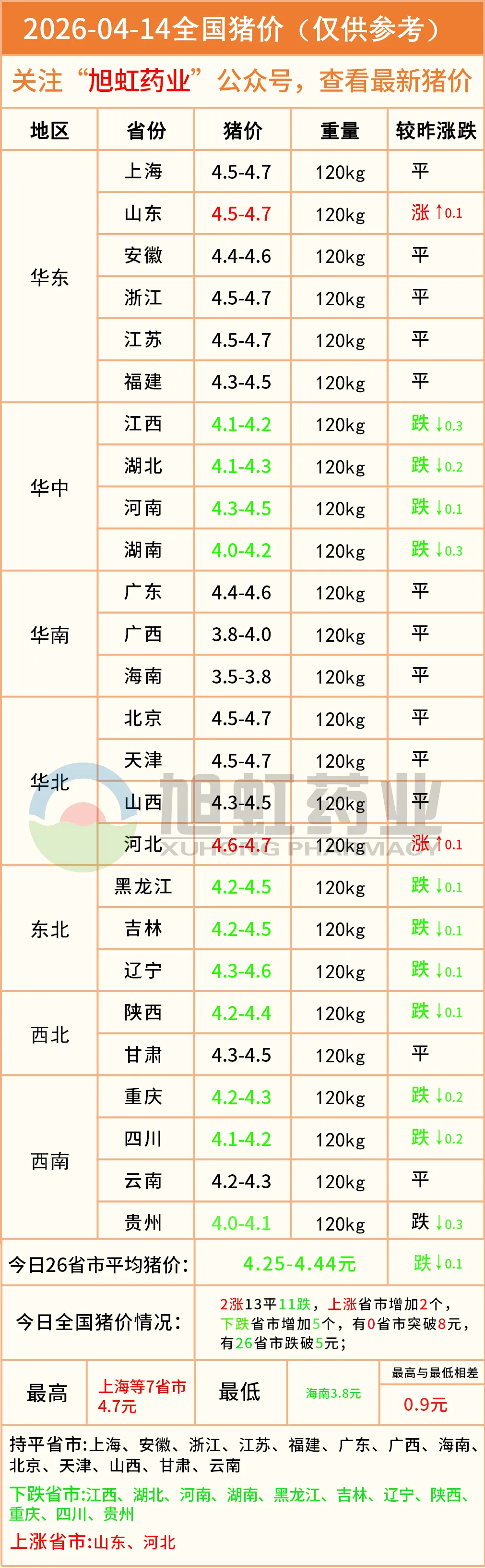 明日猪价——2026年04月14全国生猪价格! 养羊网 2026-04-13 明日猪价——2026年04月14全国生猪价格! 养羊网 2026-04-13 上一篇:猪价一览|2026年4月14日 (明日猪价早知道) 下一篇:养猪客|2026.4.14|明天猪价分析(只供参考) 您可能还会对下面的文章感兴趣111: 相关文章 张北牛市牛源,想买牛老板可以咨询价格 养骆驼成致富好项目:深挖养驼业念好农牧民“致富经” 【稳】4月13日鸡蛋价格/老母鸡价格/原料价格/鸡雏价格 近期价格更新!!!