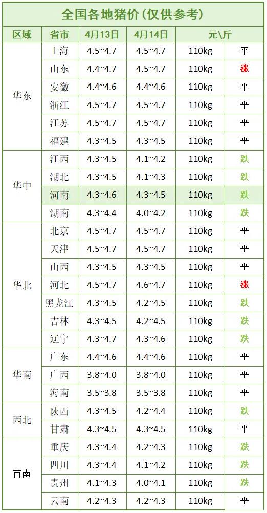 | ? ? ?4 月 14 日生猪市场稳跌互现。主流区域小幅下跌,少数地区窄幅持平;养殖端挺价、屠企压价,低位博弈加剧,全行业深度亏损。? |