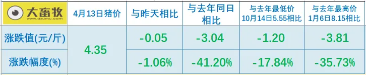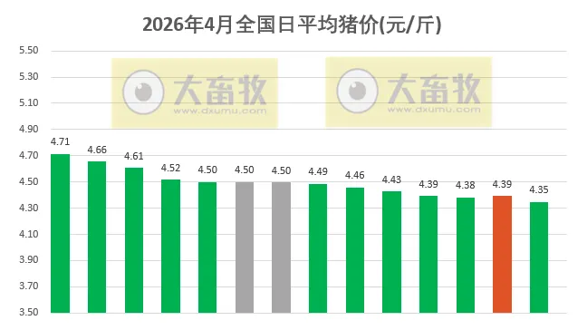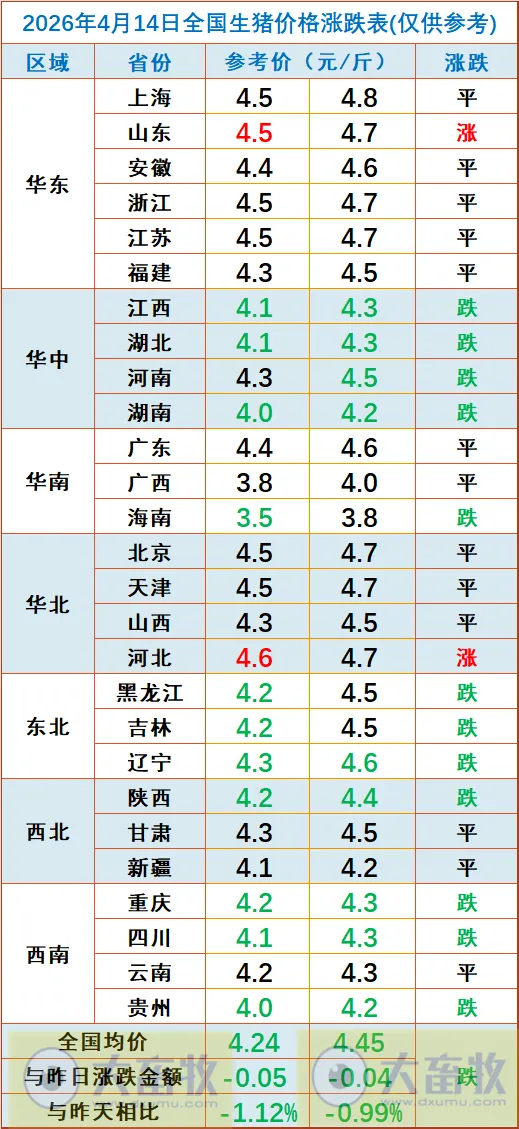 大畜牧小编根据我国27省的猪价数据,计算出2026年4月14日全国平均猪价为每斤4.35元,比昨天下跌0.04元,跌幅为1.06%,上涨力度不够,又转跌了,且再次创新低;