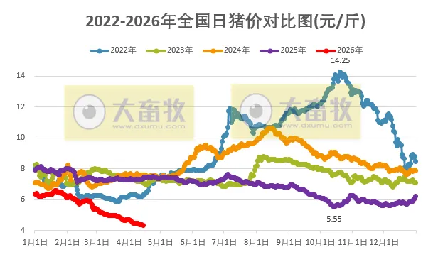 与去年同一天相比,猪价下跌了3.04元,跌幅为41.2%,且低于前6年同期;
