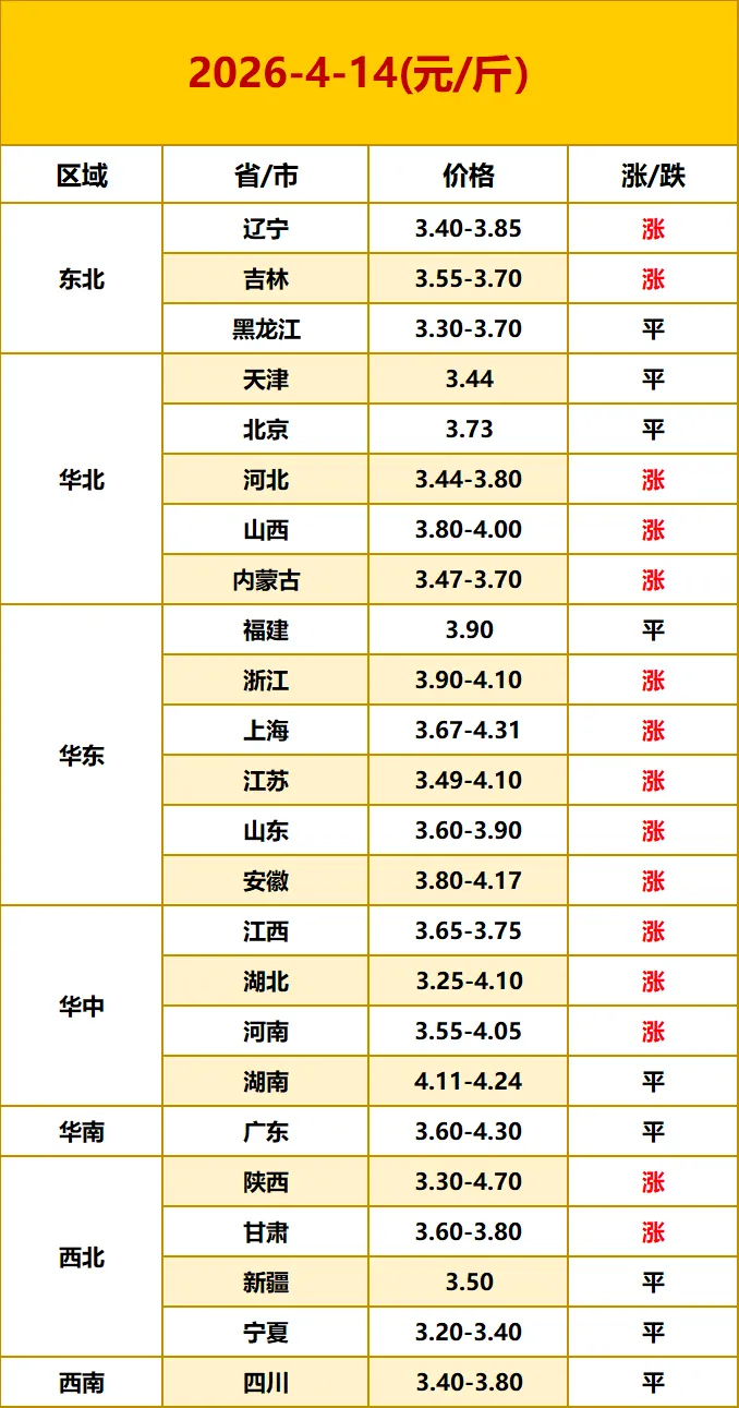【鸡蛋价格】2026.4.14—最新鸡蛋价格 养羊网 2026-04-13 【鸡蛋价格】2026.4.14—最新鸡蛋价格点击蓝字关注我们吧~价格仅供参考 养羊网 2026-04-13 上一篇:养羊种草方案 下一篇:20260414鸡蛋价格早报 您可能还会对下面的文章感兴趣111: 相关文章 亚运会同款鸡蛋!?12.9元到手1大箱! 猪价一夜起航!猪价全面突破,涨价要涨的更猛烈吗? 术语学习:“林下经济” 关于我的猫,差点去了宠物店几十万卖给你们