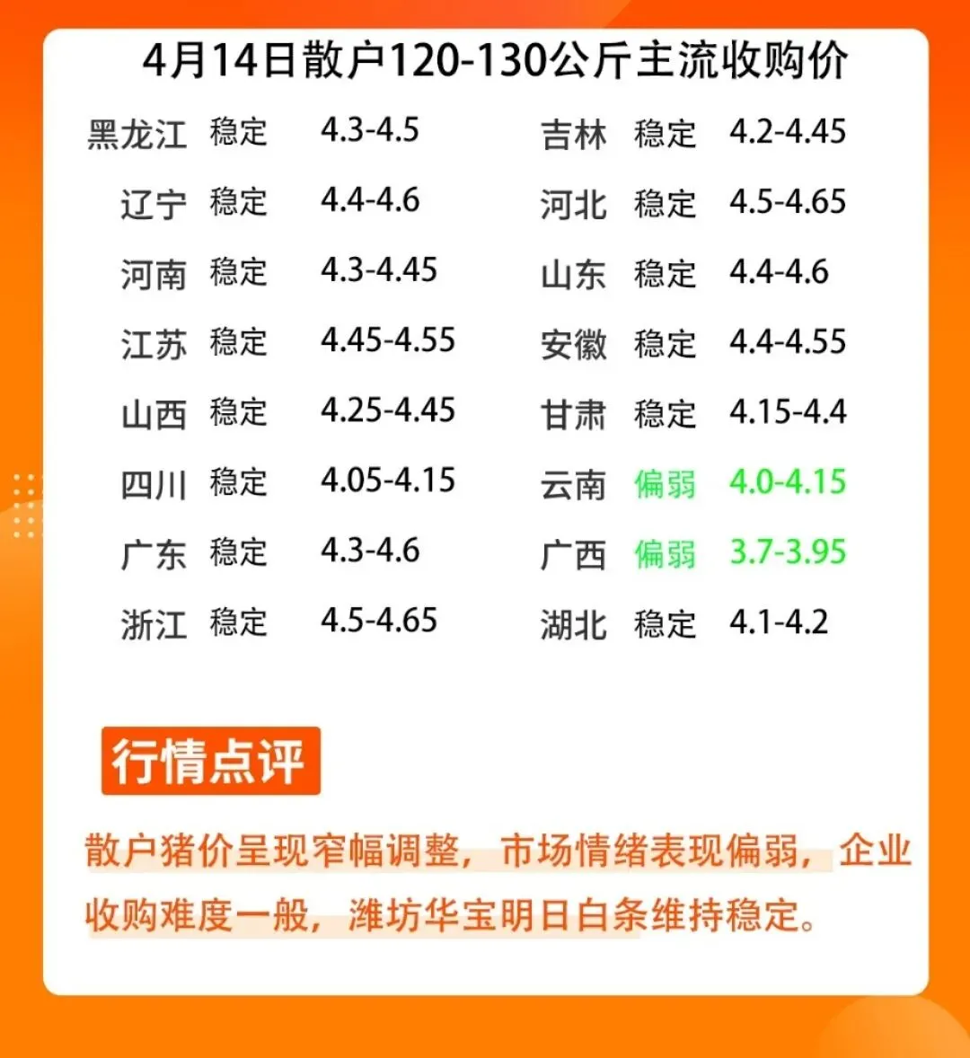 4月13日晚间猪价信息,今晚猪价情绪表现一般偏弱,屠宰企业采购难度一般,今晚白条猪价呈现稳定为主,潍坊华宝、山东牧原、河南牧原、江苏牧原、安徽牧原白条出场价格维持稳定,东北牧原白条出场价格稳中伴涨200元/吨,预计明日北方集团猪价呈现稳中偏弱,南方地区集团猪价呈现稳中偏弱,重点关注集团猪场上猪上市量。