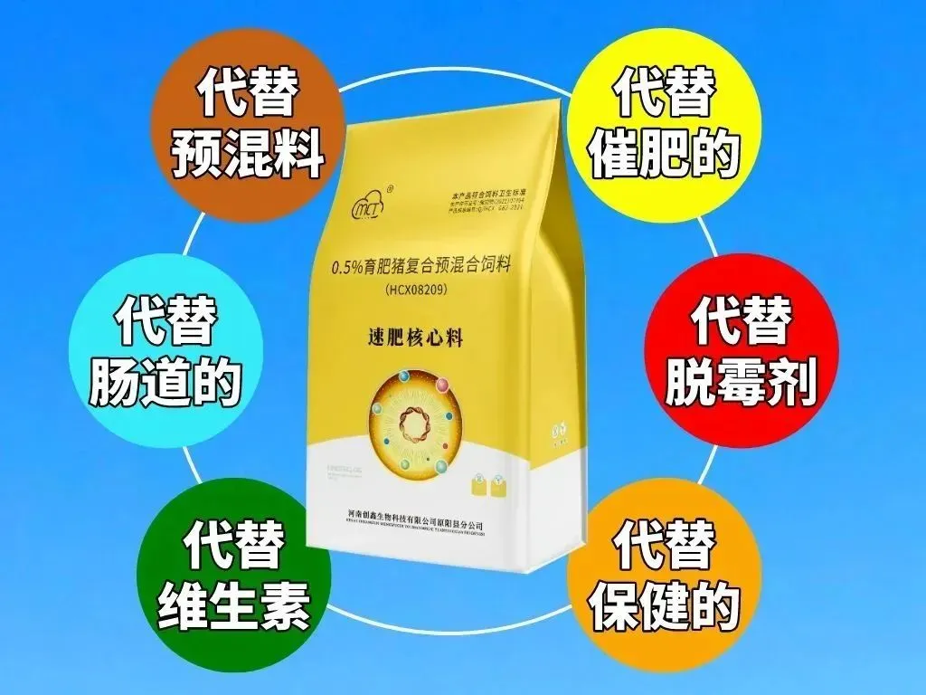 重在研究通过提升饲料营养转化,实现节粮减粮从而实现降本增效的目的,把动物必须的营养成分精确分析,经科学配比以及临床试验,把预混料再次浓缩,把载体和石粉以及食盐去掉,添加酶制剂和有益菌,肠道调解剂和促生长成分,降本和增效两方面同时进行,做成0.5%《速肥核心料》