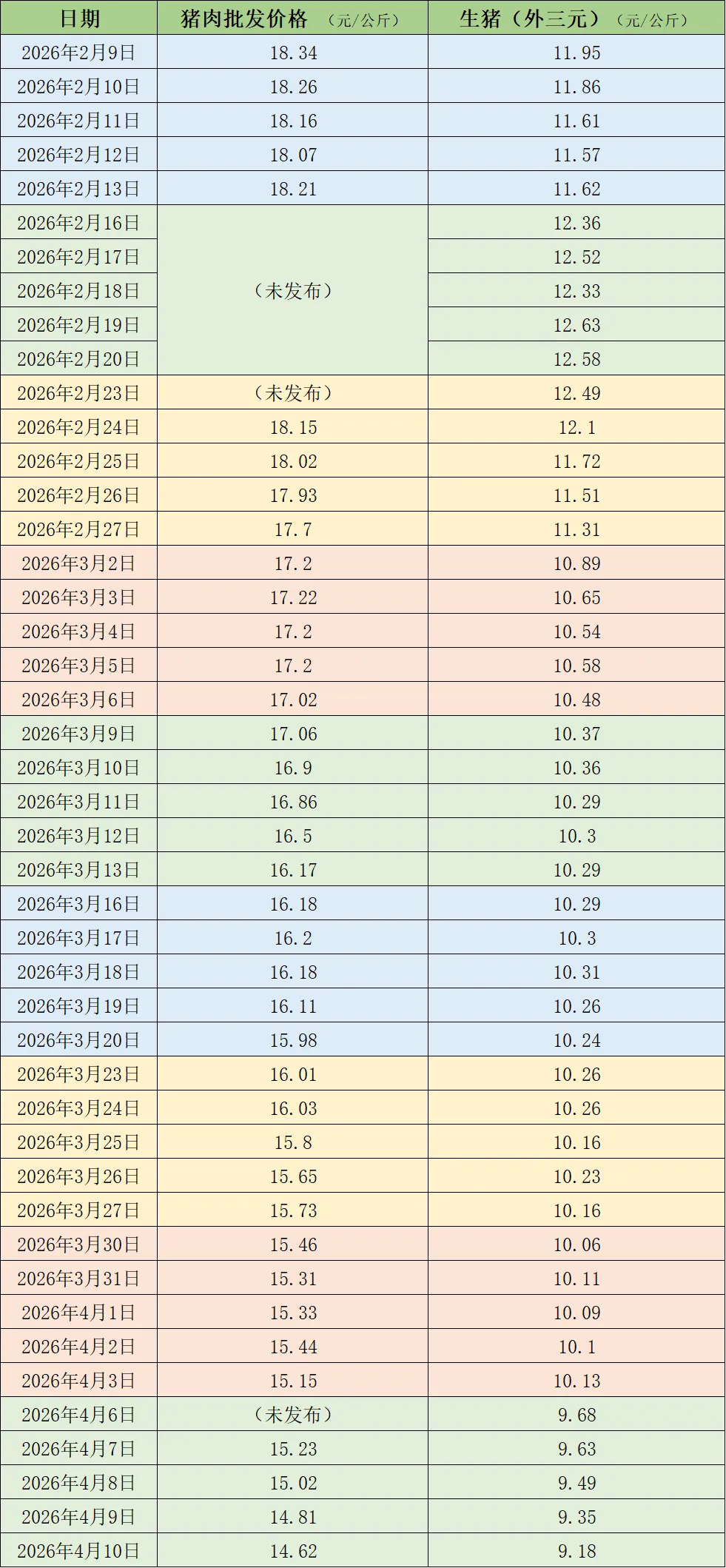近期的猪肉和生猪价格。制表澎湃新闻