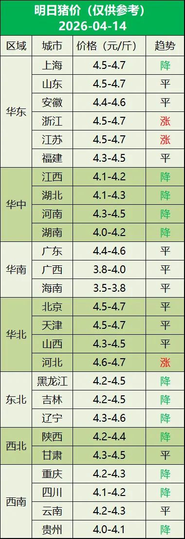 明日猪价(2026年04月14日) 养羊网 2026-04-13 明日猪价(2026年04月14日) 养羊网 2026-04-13 上一篇:明日猪价 | 2026.4.14日~全国各地最新猪价(猪价已更新) 下一篇:【明天猪价】2026.4.14日全国猪价(已更新!) 您可能还会对下面的文章感兴趣111: 相关文章 4月10日 | 正业生物猪价快报! 如何挑选种羊 2月3日领航农牧猪价汇总 【明天猪价】2026.3.27全国猪价已更新)