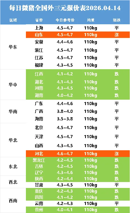 明日最新猪价2026.04.14点击蓝字关注 猪价不错过