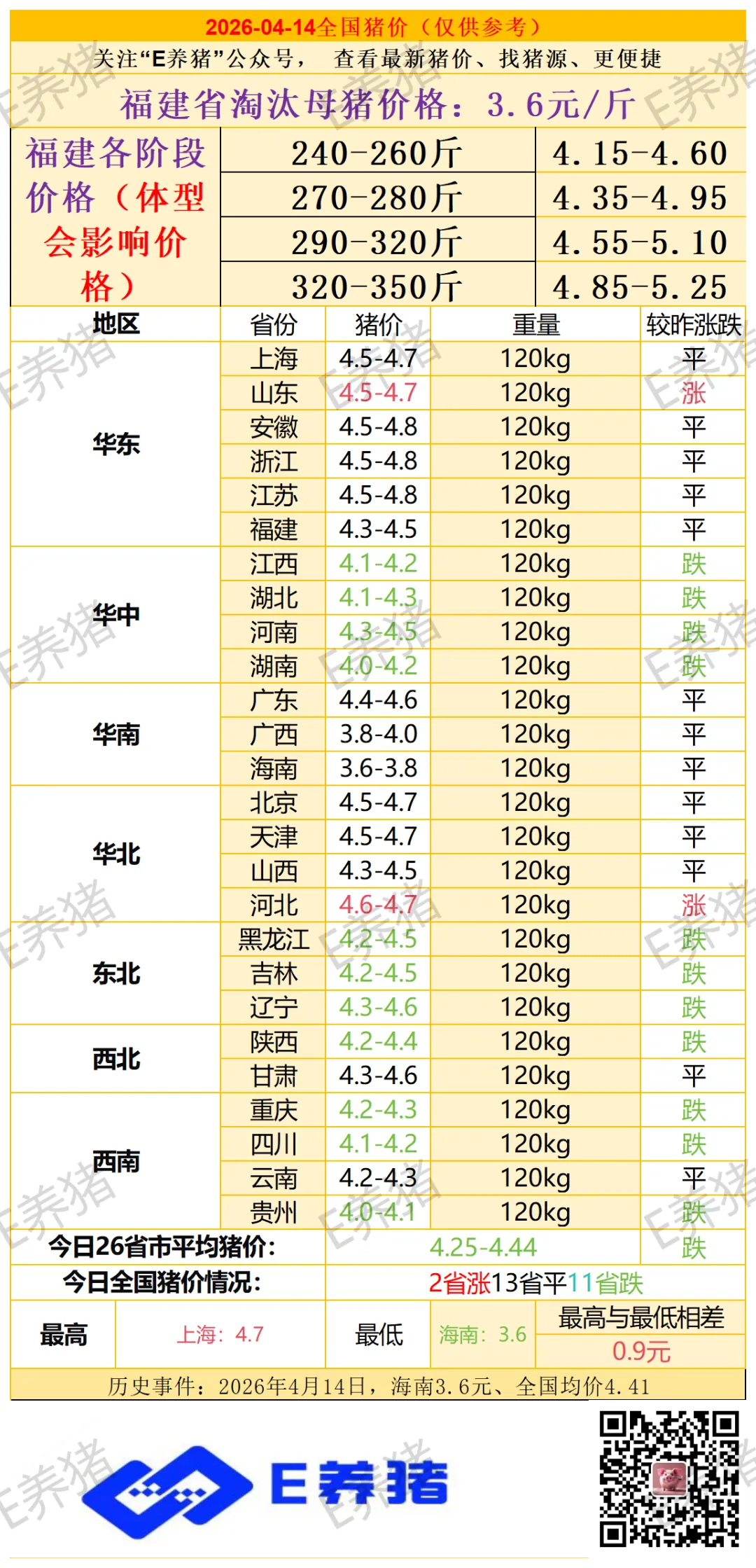 2026年4月14日猪价(供大于求)每日新增淘汰母猪价格、全国30天均价走势