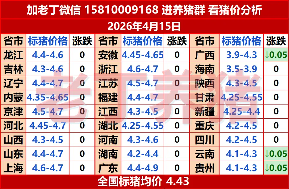 猪价调整!【明天猪价】4月15日全国猪价涨跌表! 养羊网 2026-04-14 猪价调整!【明天猪价】4月15日全国猪价涨跌表! 养羊网 2026-04-14 上一篇:【明日猪价】2026.04.15-全国明日最新猪价信息! 下一篇:猪价跌破5元创历史新低:这场嗜血猪周期谁是最惨的那个? 您可能还会对下面的文章感兴趣111: 相关文章 路过的宝子们进来留下你的评论 山西稷山三青年下乡修电器拓展市场好致富 2026年01月29日全国猪价概览 在贵阳找了30年的清水烫!居然藏在商场里