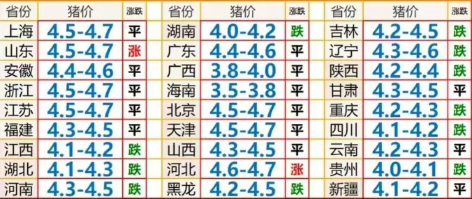 4.14猪价继续探底全国均价4.32元 养羊网 2026-04-14 4.14猪价继续探底全国均价4.32元 养羊网 2026-04-14 上一篇:【养猪行情】2026.04.14-猪价行情! 下一篇:广西涨!4月14日南宁鸡蛋参考价格:涨! 您可能还会对下面的文章感兴趣111: 相关文章 内蒙0-1岁羔羊肉?做法 2025年4月13日全国各地生猪价格信息 近期价格更新!!! 11.17鸡蛋销售价格