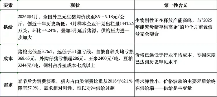 第一性原理推演猪价走势 养羊网 2026-04-14 第一性原理推演猪价走势第一性原理推演猪价走势生猪价第一性原理的底层逻辑从第一性原理看生猪价格,需要剥离所有表层因素,回归最本质的物理和经济学基础。核心结论是:生猪价格由“猪肉供需关系”决定,而供需关系的底层是“生物规律”与“经济理性人行为”的耦合。我们可以拆解为三个层层递进的底层逻辑:1.?供给的底层是生物学刚性生猪的生长有不可压缩的物理周期(约10个月:怀孕4个月+育肥6个月)。这意味着无论价格多高,都无法在短期内增加供给;同样,即使亏损,存栏猪也必须继续喂养。这种生物刚性是猪价剧烈波动(猪周期)的根本物理约束。2.?需求的底层是相对静态的消费习惯猪肉作为蛋白来源,需求对价格不敏感(缺乏弹性)。即使涨价,人们也不会大幅少吃;跌价也不会顿顿狂吃。因此,价格波动的主要矛盾几乎永远在供给端。3.?价格围绕“养猪成本”这个引力中心波动长期看,猪价必然回归行业平均成本(饲料、仔猪、防疫、人工等)。因为:当价格远高于成本时,养殖利润丰厚,资本和养殖户必然扩产(经济理性),最终导致供过于求、价格回落。当价格远低于成本时,深度亏损导致现金流断裂,养殖户被迫退出或减产,最终供不应求、价格回升。生猪价的第一性原理可以从多个维度理解1.生物生产周期与供给滞后生猪从补栏到出栏需约10个月,母猪扩繁到形成有效供给接近1.5年。这种生产周期的刚性导致供给无法即时响应价格变化,是猪价波动的底层基础。即使价格变化,供给调整存在明显滞后,形成“猪周期”的根源。2.成本结构与效率差异???饲料成本主导:饲料占养殖总成本的50%以上,料肉比(饲料消耗量与体重增重量的比值)是关键效率指标。有效料肉比越低,单位猪肉的饲料成本越低,企业竞争力越强。??固定成本与沉没成本:现代规模化养殖需大量土地、设备投入,固定成本高,停产会导致沉没成本损失。因此,企业即使亏损也可能继续生产,以摊薄固定成本,延缓产能出清。3.供需平衡与市场出清?供给端:能繁母猪存栏量是决定生猪出栏量的核心指标。当能繁母猪存栏增加,未来供给增加,价格可能下跌;反之,存栏减少,供给收缩,价格可能上涨。??需求端:猪肉消费受居民收入、饮食结构、替代品价格等因素影响。若需求增长缓慢或替代品(如禽肉、牛羊肉)竞争力增强,猪肉需求可能下降,压制价格。4.政策与外部干预猪肉在中国CPI中权重高,关乎国计民生。政府可能通过收储、补贴、信贷展期等手段干预市场,稳定供应和价格,这会影响市场出清节奏,使猪价波动更复杂。因此,生猪价的第一性原理也可理解为:在有限资源(土地、粮食、资本)约束下,通过生物生产周期、成本效率、供需平衡及政策干预的相互作用,形成价格波动机制。生猪价第一性原理各因素分析1.?最底层:供需关系(根本)价格?=?供给量?÷?需求量供给核心:能繁母猪存栏量?→?决定?10–12个月后的出栏量;官方基准:3900万头合理;3650万头预警线。效率提升(PSY/MSY):同样母猪→更多猪,隐形产能暴增需求核心:季节性+消费习惯+替代肉品旺季:春节、腌腊、中秋(需求增长20~30%);淡季:3–5月、夏季(需求下降15~20%);替代:禽肉、牛羊肉便宜,分流猪肉需求。2.?生物学刚性:猪周期(滞后性)生产周期?≈?10–13个月后备母猪?→?配种?→?妊娠?→?仔猪?→?育肥?→?出栏;价格信号严重滞后:现在涨价?→?10个月后才多出栏;现在跌价亏损?→?也要几个月才去化产能;经典循环:涨价→补栏母猪→10个月后供过于求→跌价→淘汰母猪→供不应求→再涨价3.?成本底线:底部支撑(不能长期跌破)养殖成本?≈?猪价底部饲料(玉米+豆粕)占?70%以上成本;长期低于成本?→?持续亏损?→?产能加速去化?;猪粮比?<5:1 → 一级预警、收储托底。4.?第一性原理公式(简化)生猪价格?≈?f(能繁母猪存栏?×?PSY,?季节需求,?饲料成本,?政策调控)。应用第一性原理推演接下来几个月的猪价趋势一、底层三要素的现状二、基于第一性原理的走势推演阶段一:短期(4月中旬至5月)——成本引力失效,价格继续探底根据"价格低于成本→亏损→去产能启动"的链条,当前正在发生的是去产能的前半段,而不是价格反转。供应端的生物刚性仍在释放:前期高位能繁母猪存栏(2025年末3961万头)决定的出栏量高峰,将持续至2026年中。4月样本企业日均出栏量环比提升,叠加降体重出栏计划,供应端看不到收缩信号。短期内"供强需弱"格局无法扭转:五一备货或带来弱势反弹(预计回升至4.5–4.7元/斤区间),但受限于产能基数过大,反弹空间极其有限,大概率在反弹后继续回落。结论:短期价格仍在"磨底"阶段,尚未出现趋势性反转的信号。阶段二:中期(6月至7月)——?亏损的累积效应是关键变量这是第一性原理中最关键的传导环节。行业已连续亏损6个月(自2025年10月起),且亏损程度持续加深。按照"亏损持续→现金流断裂→养殖主体被迫退出→能繁母猪存栏实质性下降→10个月后供给收缩→价格上涨"的链条:当前还处在"亏损持续→去产能加速"的拐点附近,尚未进入"供给收缩"阶段。若4–5月持续深度亏损,大量中小散户和高成本企业将在现金流枯竭后被迫淘汰母猪。这部分去产能的效果,将在2026年四季度至2027年初传导至商品猪出栏。6–7月处于去产能加速期和供给收缩之间的"时滞"阶段,价格大概率仍在底部震荡,但向下空