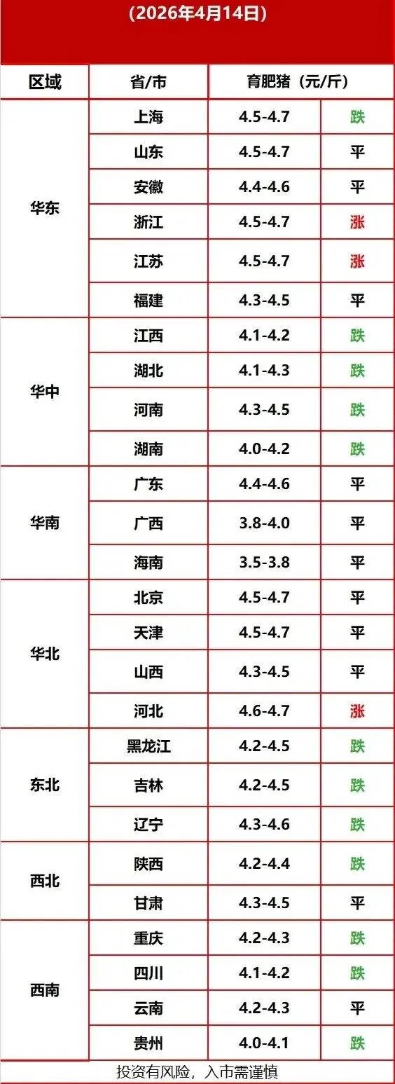 4月14日猪价 养羊网 2026-04-14 4月14日猪价每日猪价行情4月14日猪价点点赞推 荐 阅 读中东战火如何烧高我们的猪饲料?养猪人必看的成本预警!真金白银!温氏股份拟最高12亿回购,向市场释放最直接信号美国大豆想回中国餐桌?13%关税挡路,巴西笑了www.chinabreed.com中国养殖网编辑:郑高兴来源:中国养殖网、网络 养羊网 2026-04-14 上一篇:猪价已经12年最低何时反弹? 下一篇:猪价跌入“冰点”,头均亏超500元!浙江生猪市场三月数据透出哪些信号? 您可能还会对下面的文章感兴趣111: 相关文章 大黄的猪蹄已经上得厅堂下得厨房了 近期价格更新!!! 近期价格更新!!! 2026.02.23-今天猪价