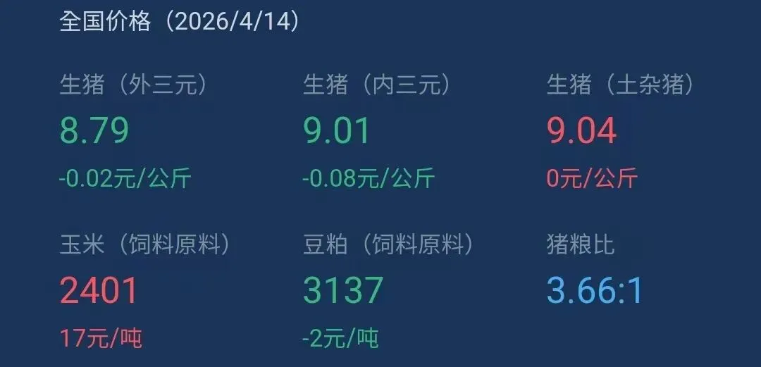 一、今天(2026年4月14日)全国生猪标准体重平均价格8.7-9.3元/公斤,同比昨日(2026年4月10日)价格上涨跌0.05元/公斤。