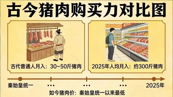 目前的猪价低迷已经低出圈了,各种媒体纷纷报道讨论,甚至有自媒体博主用人工大智能模型统计分析,发现如果用“人均月收入能买多少斤猪肉”来比较,AI给出的结论是:目前的猪价是秦始皇统一六国以来,最便宜的!