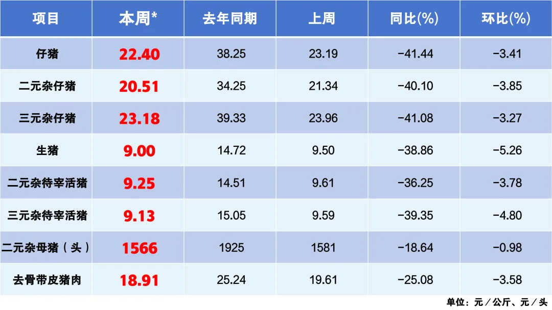 本周生猪平均价格为9.00元/公斤,较上周下跌5.26%,同比跌幅达38.86%。其中,二元杂待宰活猪9.25元/公斤,环比下跌3.78%;三元杂待宰活猪9.13元/公斤,环比下跌4.80%。