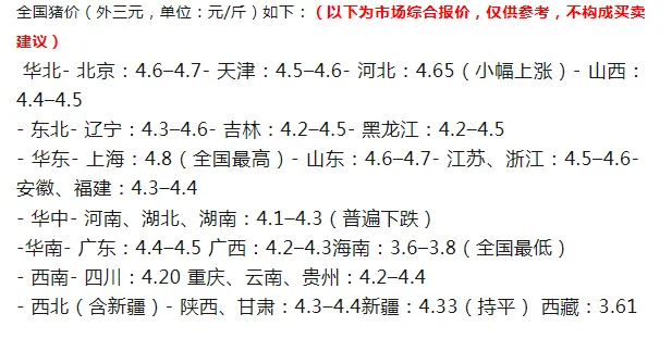 【明天猪价】2026.4.15全国猪价 (已更新!) 养羊网 2026-04-14 【明天猪价】2026.4.15全国猪价 (已更新!)- 外三元生猪:4.33 元/斤- 白条猪批发:15.80–16.27 元/公斤 养羊网 2026-04-14 上一篇:今日猪价|明天猪价分析2026.4.15 下一篇:【明天猪价】2026.4.15全国猪价已更新) 您可能还会对下面的文章感兴趣111: 相关文章 今晚不睡了 熬夜撩大汉 哇!我在江西大山放养日常 猪价跌破5元,为何“二师兄”成了最惨主角? 网上买土鸡蛋,土鸡都是智商税