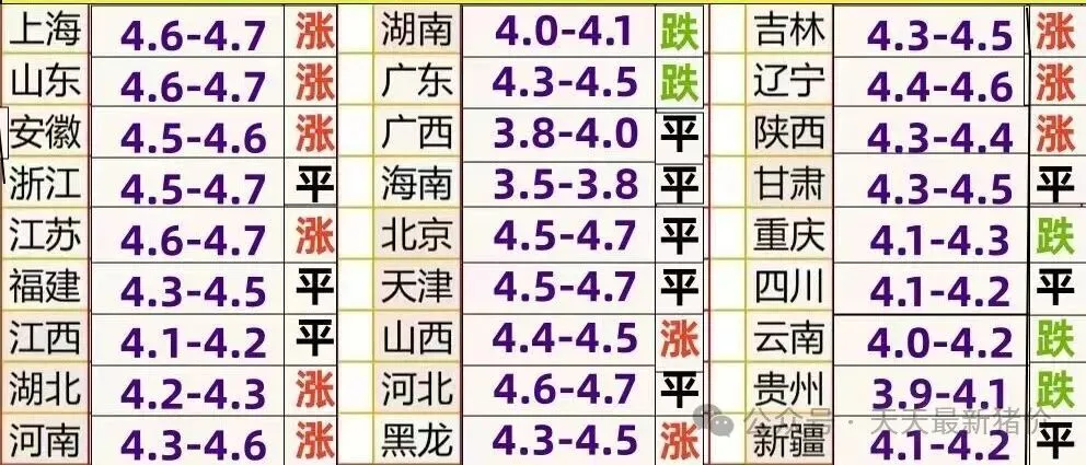 分地区看,今天东北地区散户吉林稳定为主,黑龙江哈尔滨大江牡丹江鑫鹏明水屠企下跌,辽宁诚信味邦大连茂三础明食品下跌,辽宁星源食品稳定,吉林长春佳龙稳定。猪企方面,东北大北农东北新希望稳定为主,东北牧原上涨。今天黑龙江主流价4.2-4.4元个别大圈4.5元,吉林主流价4.2-4.5元,辽宁主流价4.3-4.6元!
